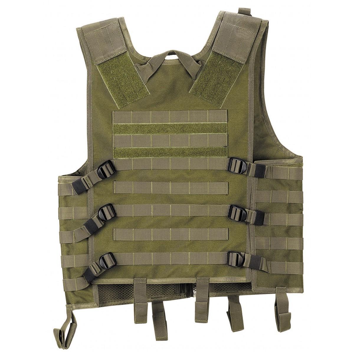 Taktická vesta s modulárnym systémom MOLLE, stredovým zipsom a 3 klipsňami, ktoré zips dodatočne zabezpečujú.