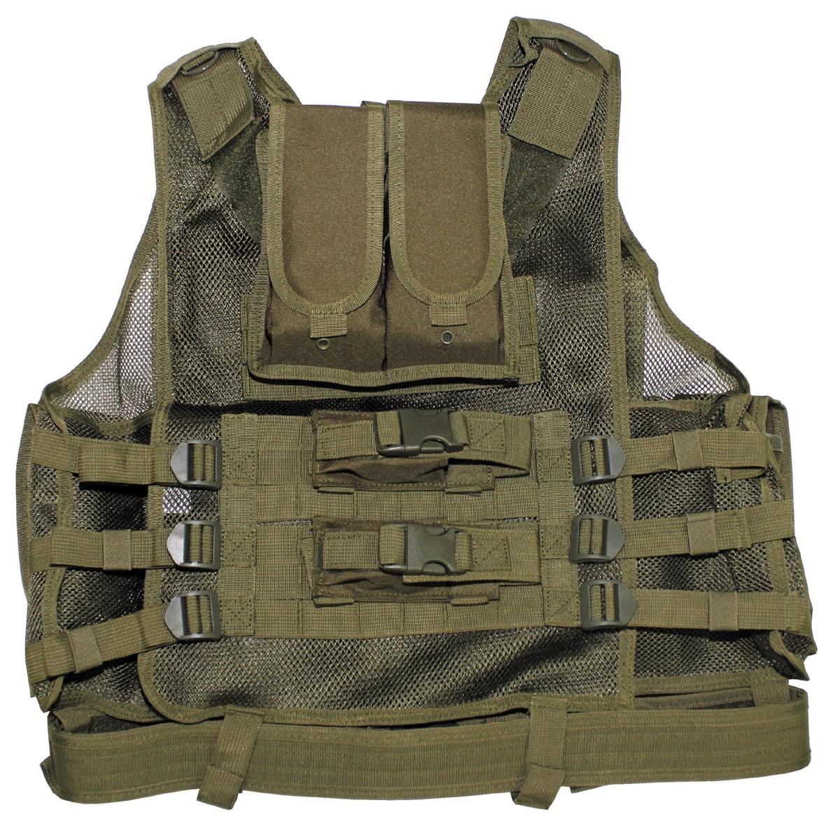 Profesionálna taktická vesta s priedušným chrbátom, vystuženou vrchnou časťou, nylonovým opaskom a rôznymi kapsami.
