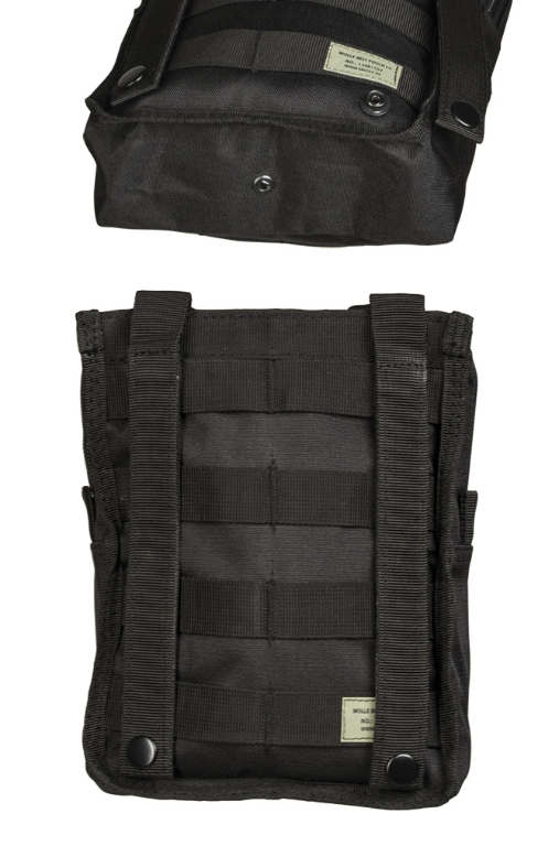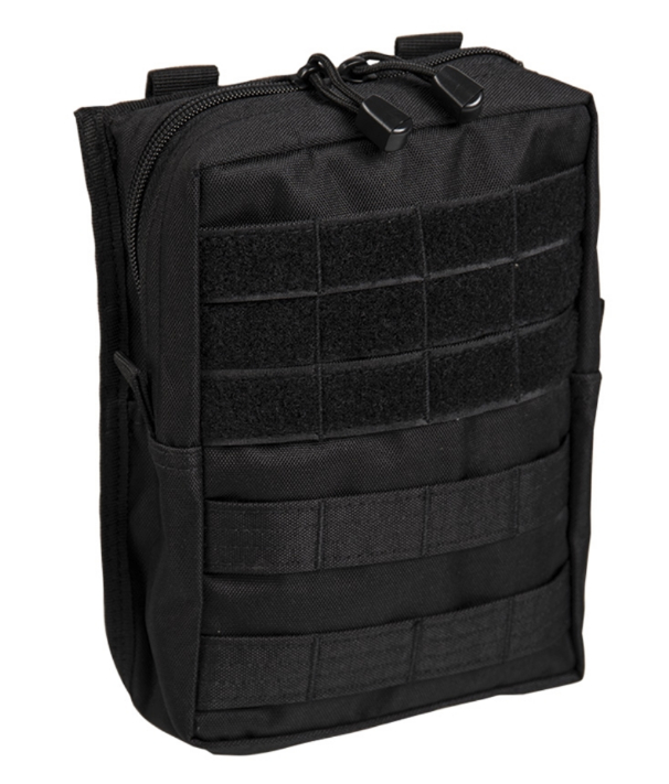 Borsetă verticală echipată cu sistem MOLLE. Închidere cu fermoar dublu sens. Include și un panou velcro pentru patch-uri.