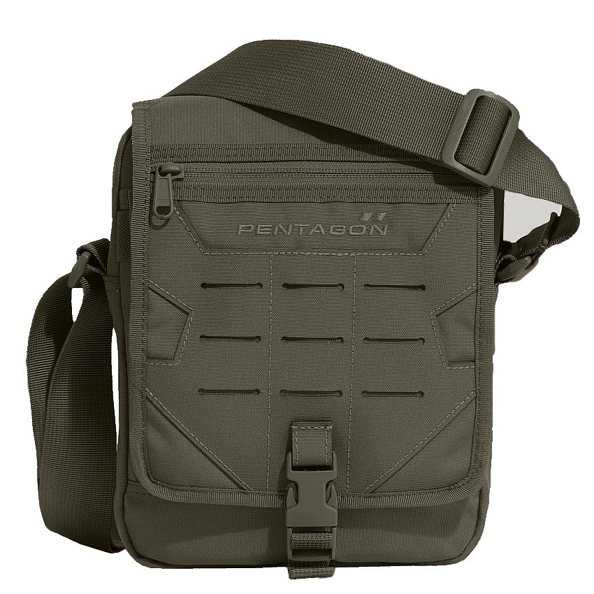 Geantă multifuncțională de umăr de la compania Pentagon. Datorită compartimentării generoase, geanta poate servi și ca bază pentru un set EDC. Pe partea din față se află o clapetă cu o cataramă din plastic DuraFlex® care include sistemul Molle și un compartiment închis cu un fermoar clasic, de calitate.