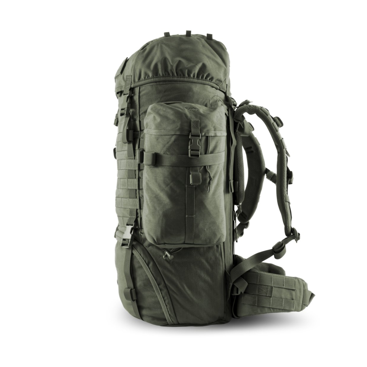 Volumul de 65l include deja două buzunare laterale detașabile de 5,25l, care sunt atașate pe rucsac prin sistemul MOLLE și pot fi ajustate sau utilizate ca buzunare independente.