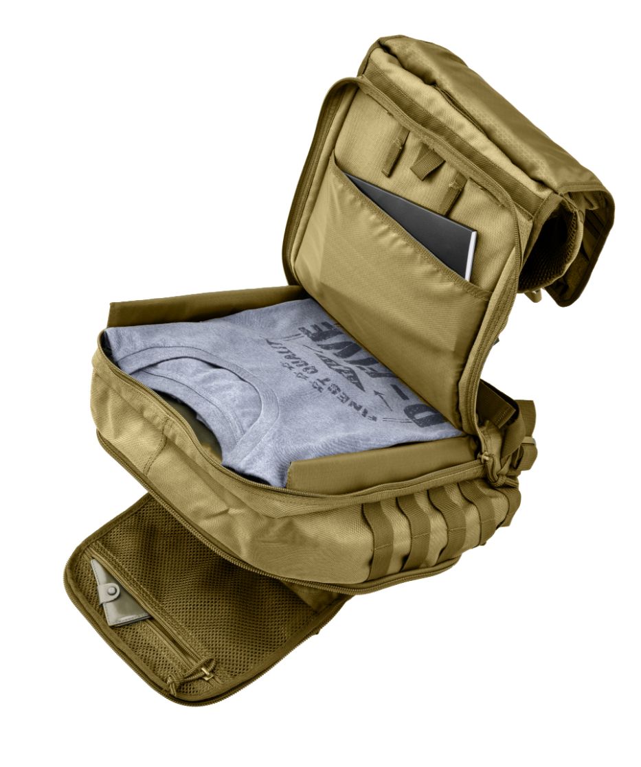 Compartimentul principal include un mic organizator din plasă pentru obiecte mai mici. Pentru accesorii sunt utile și cele 4 buzunare frontale. În partea din spate se află un compartiment mai mic, bine căptușit pe laterale și în zona spatelui, potrivit atât pentru un sistem de hidratare, cât și pentru un laptop mai mic. Rucsacul integrează și caracteristici standard ale unui rucsac tactic: panouri velcro, curele de compresie și sistem MOLLE pe diferite părți.