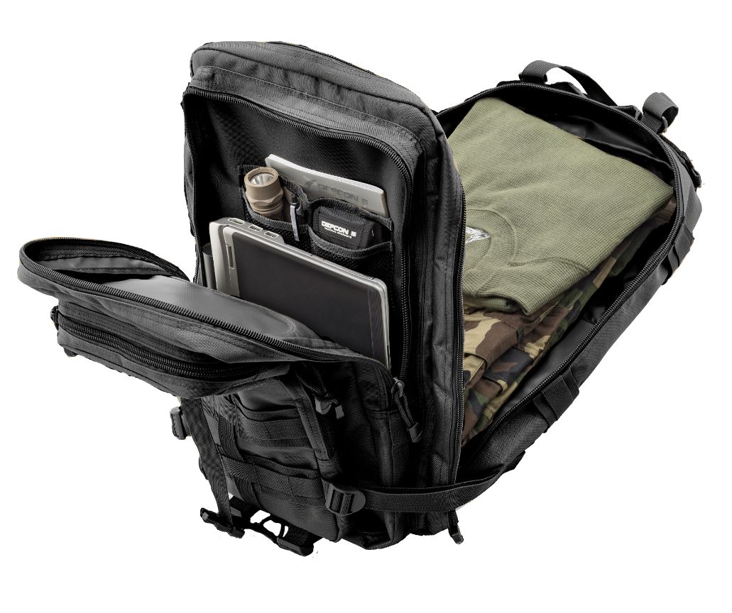 Acest rucsac de la brandul italian Defcon5 este certificat pentru armatele NATO. Este un model conceput pentru acțiuni rapide și deplasări. Este compatibil cu rezervoarele de hidratare, are 2 compartimente principale și 2 mai mici în partea frontală. Spre deosebire de rucsacurile de asalt obișnuite, are și o curea de siguranță suplimentară care trece peste partea superioară a compartimentelor principale.