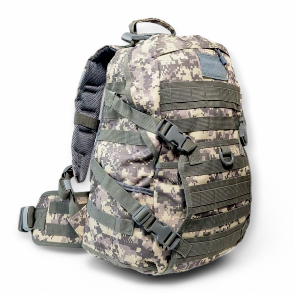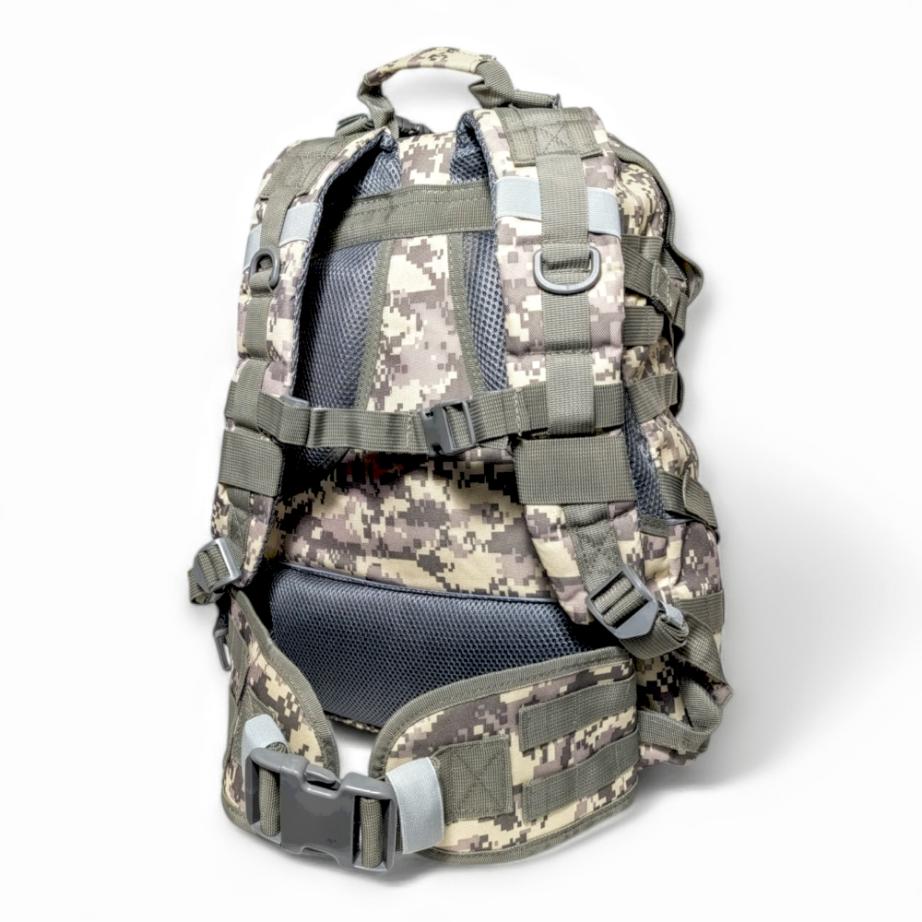 Sub această zonă exterioară se află un compartiment mai mic cu închidere tip arici. În partea inferioară rucsacul este prevăzut cu curele pentru fixarea saltelei sau a sacului de dormit. Spatele rucsacului are un sistem ergonomic și o centură lombară solidă. Cureaua de piept unește bretelele de umăr pentru o stabilitate mai bună. Bretelele sunt reglabile și includ inele tip D pentru agățarea accesoriilor. Pe laterale există buzunare pentru sticle, iar curelele de fixare permit prinderea unor obiecte mai lungi sau ovale în locul acestora. Sistemul MOLLE se află pe partea frontală, iar panoul cu velcro pentru patch-uri sau insigne este situat în partea superioară.