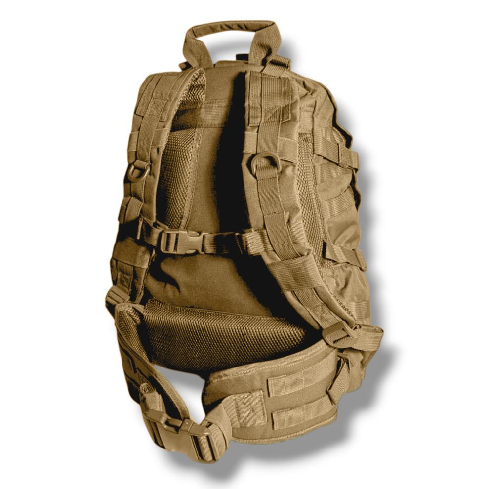 Sub această parte exterioară se află un compartiment mai mic cu velcro. În partea inferioară, rucsacul este pregătit pentru fixarea unui izopren sau a unui sac de dormit prin curele. Partea din spate a rucsacului include o căptușeală ergonomică și o centură lombară robustă. Centura toracică servește pentru conectarea curelelor de umăr, astfel încât rucsacul să stea mai stabil pe corp. Curelele de umăr sunt, desigur, ajustabile și includ inele D pentru agățarea echipamentului mic. Pe laterale, rucsacul are spațiu pentru sticle și altele. Curelele pentru fixarea spațiului exterior trec și pe laterale, astfel încât pot fixa și un obiect mai lung sau oval în loc de sticlă. Sistemul Molle se află pe partea frontală. De asemenea, un panou velcro pentru etichetare sau patch-uri este amplasat în partea superioară a părții frontale a rucsacului.