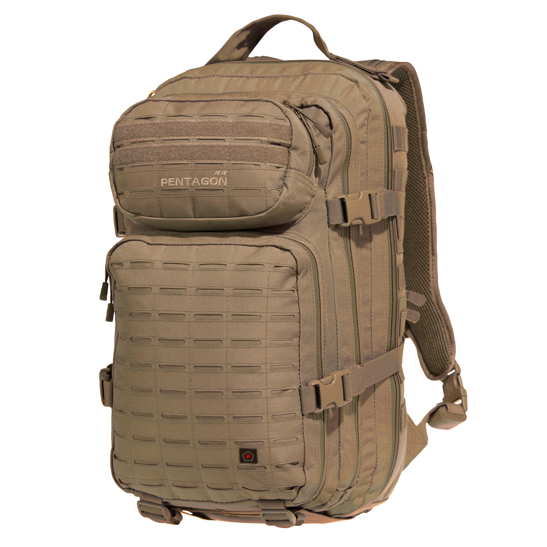 Ruksak typu Assault od výrobcu Pentagon. Kvalitné materiálové aj strihové prevedenie. Ruksak obsahuje priestor pre hydrovak, MOLLE systém je riešený systémom laser cut (vyrezávaný laserom), plastové spony sú značkové, od popredného výrobcu DuraFlex®.