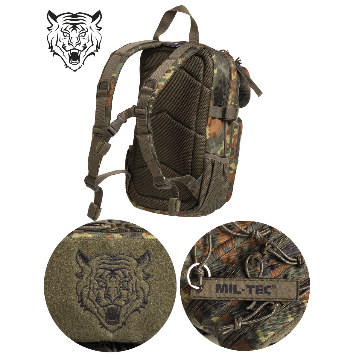 Este compus din 4 compartimente - 2 sunt mai mari și 2 mai mici pe partea frontală. Primul compartiment mai mare se deschide cu ajutorul unui fermoar cu dublu sens. Pe partea frontală se află un panou velcro pentru lipirea eventualelor patch-uri și, de asemenea, un sistem MOLLE pentru agățarea accesoriilor suplimentare. Rucsacul include și o carabină din plastic.