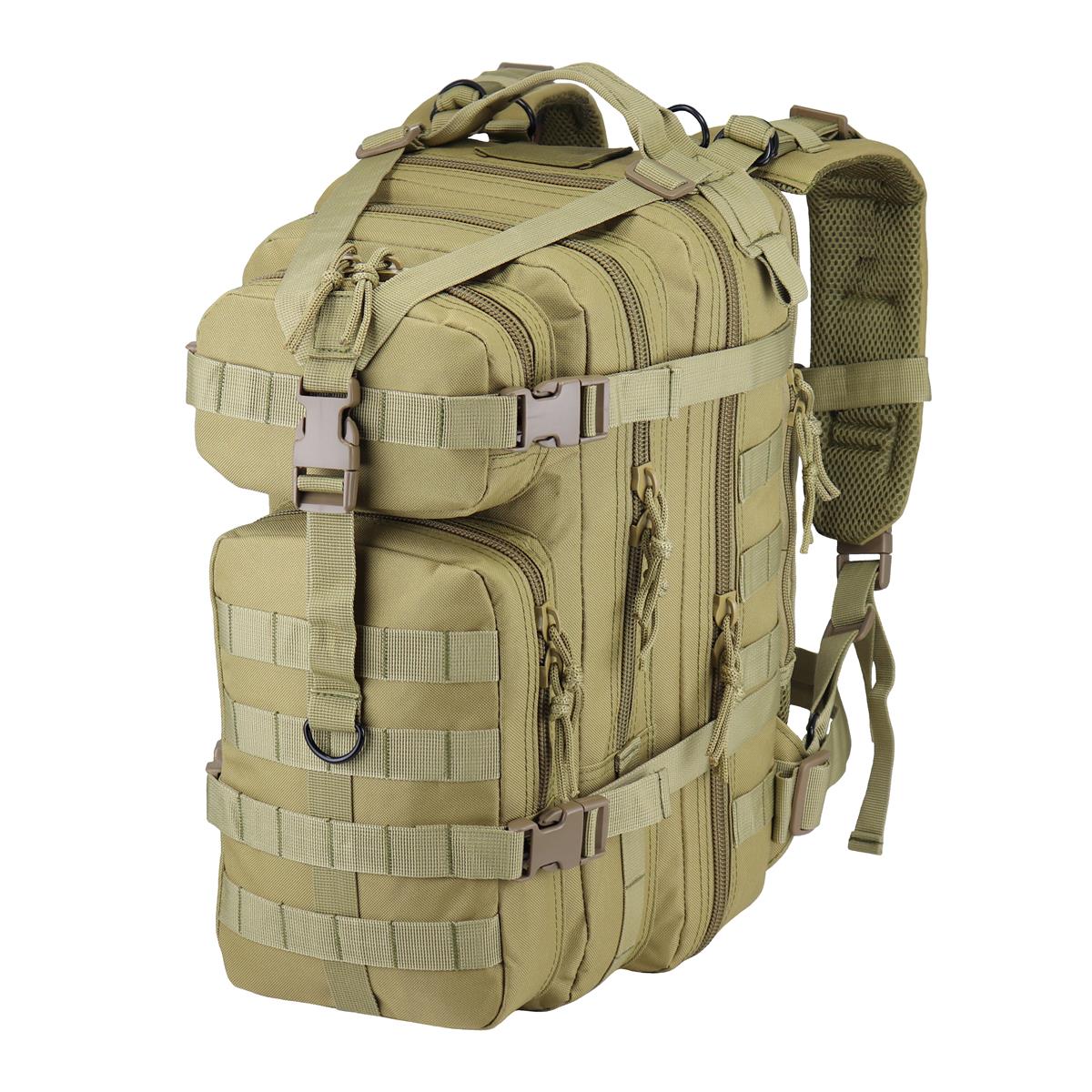 Rucsac tip Assault bine lucrat, cu 2 compartimente principale, care sunt închise cu fermoare duble. Pe partea frontală se află un compartiment mai mic și unul mai mare, ambele de asemenea închise cu fermoar. Pe partea din spate există un spațiu pentru rezervor de apă. Unele dintre compartimente includ organizator sau plasă.
