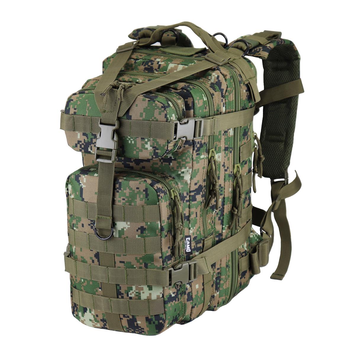 Rucsac tip Assault bine lucrat, cu 2 compartimente principale, care sunt închise cu fermoare cu dublu sens. Pe partea frontală se află un compartiment mai mic și unul mai mare, ambele de asemenea închise cu fermoar. Pe partea din spate există un spațiu pentru rezervor de apă. Unele dintre compartimente includ și organizator sau plasă.
