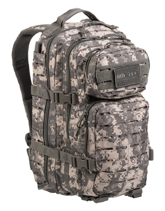 Na prednej časti ruksaku je MOLLE systém na uchytenie ďalších kapsičiek a iných doplnkov. Po stranách sú 4 kompresné popruhy so zapínaním na plastové klipy. Keďže ide o Laser ruksak, Molle systém je vyrezávaný laserom.