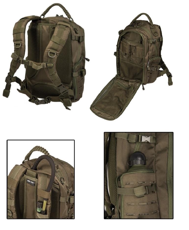 25l kompaktný model ruksaku z dielne nemeckej spoločnosti Mil-tec. Ruksak má prepracovaný dizajn a moderný laser-cut Molle systém. Hrany Molle systému sú vypalované laserom a hrany sú presné a scelené. Z vrchnej časti je namiestno klasického pútka na prenášanie zapletené paracordové pútko, ktoré je možné rozpliesť a v prípade potreby využiť na rôzne účely.