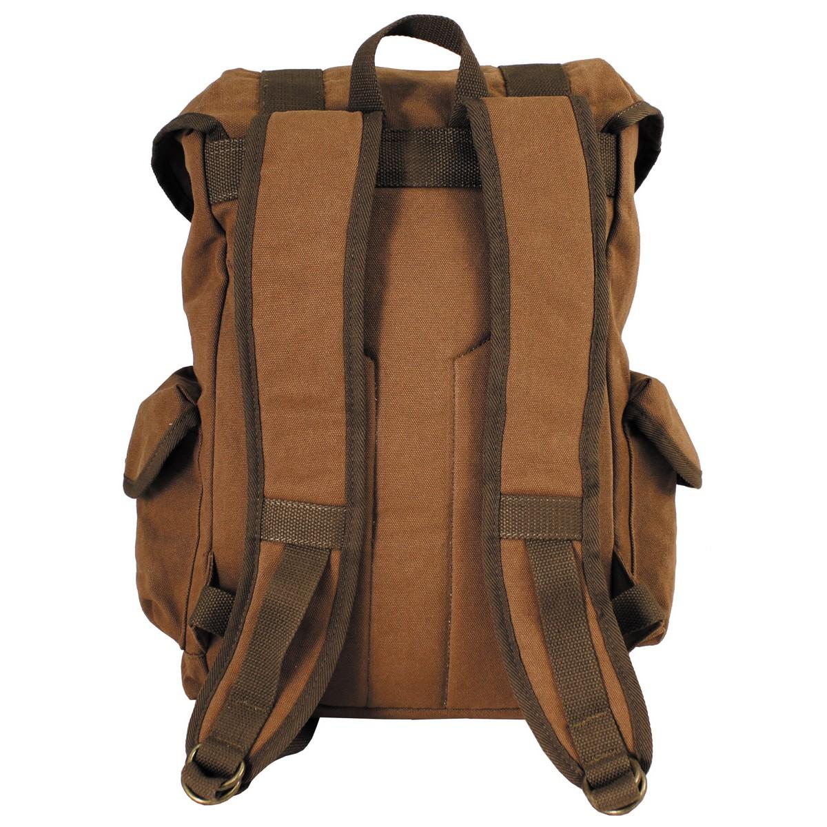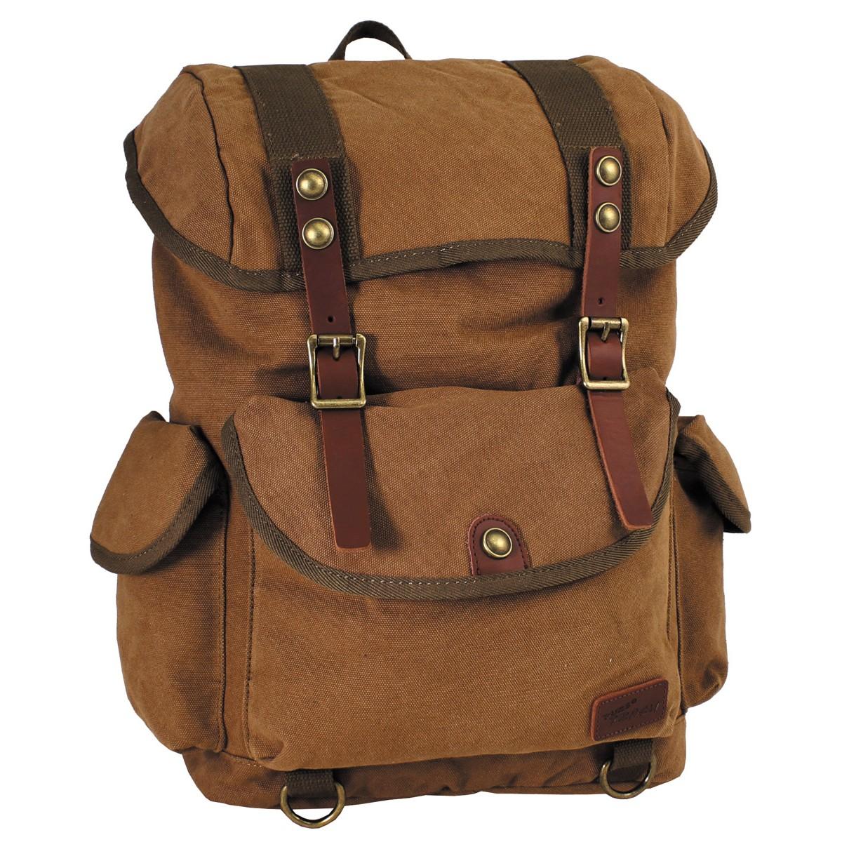 Klasický poľovnícky ruksak z látky (100% bavlna). Obsahuje kovové spony. Našité sú na ňom kožené a mosadzné doplnky.